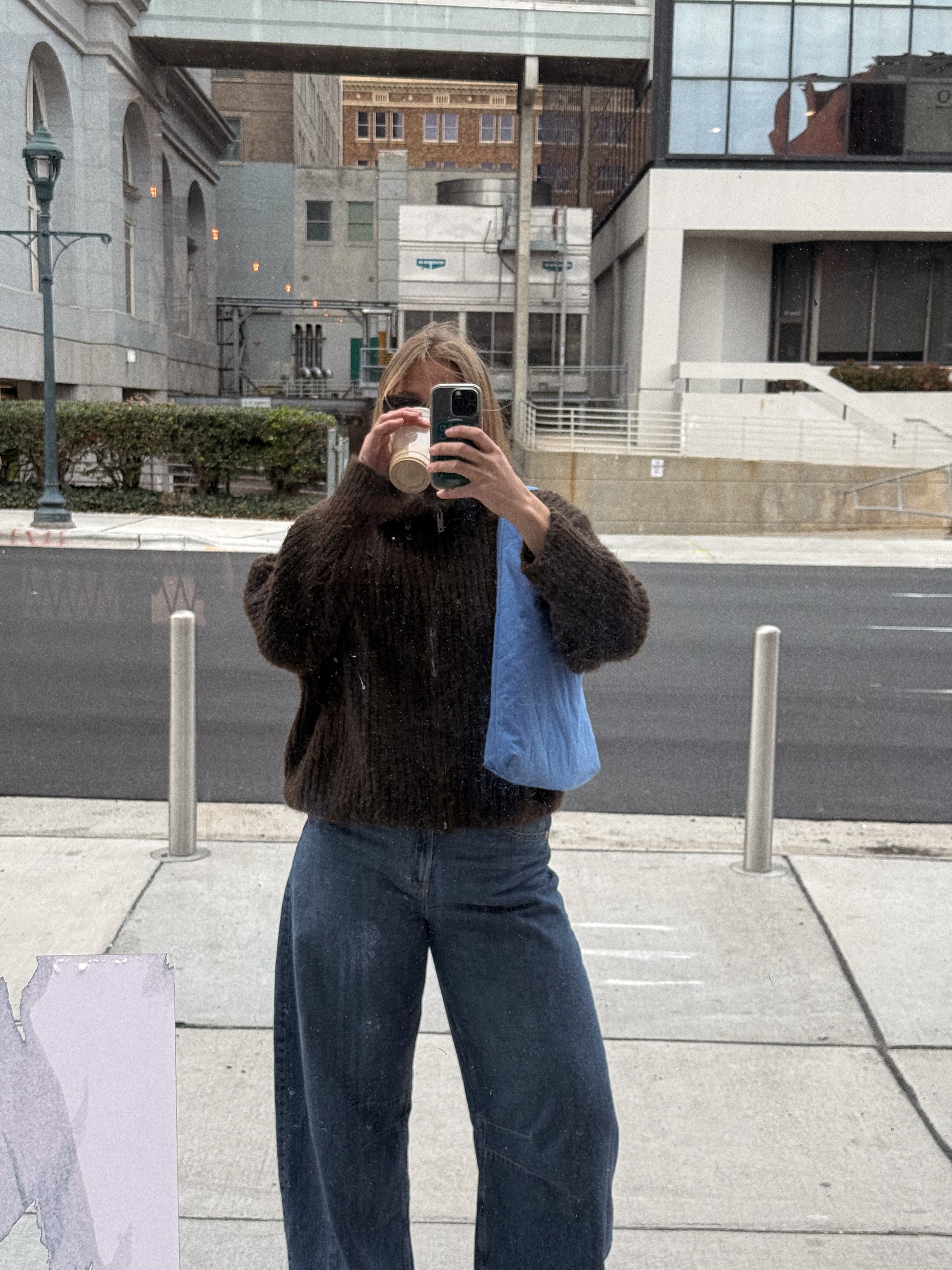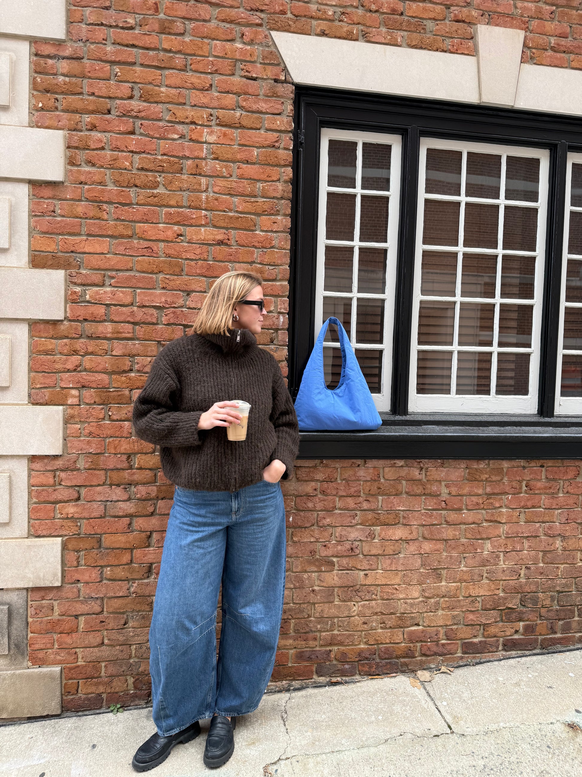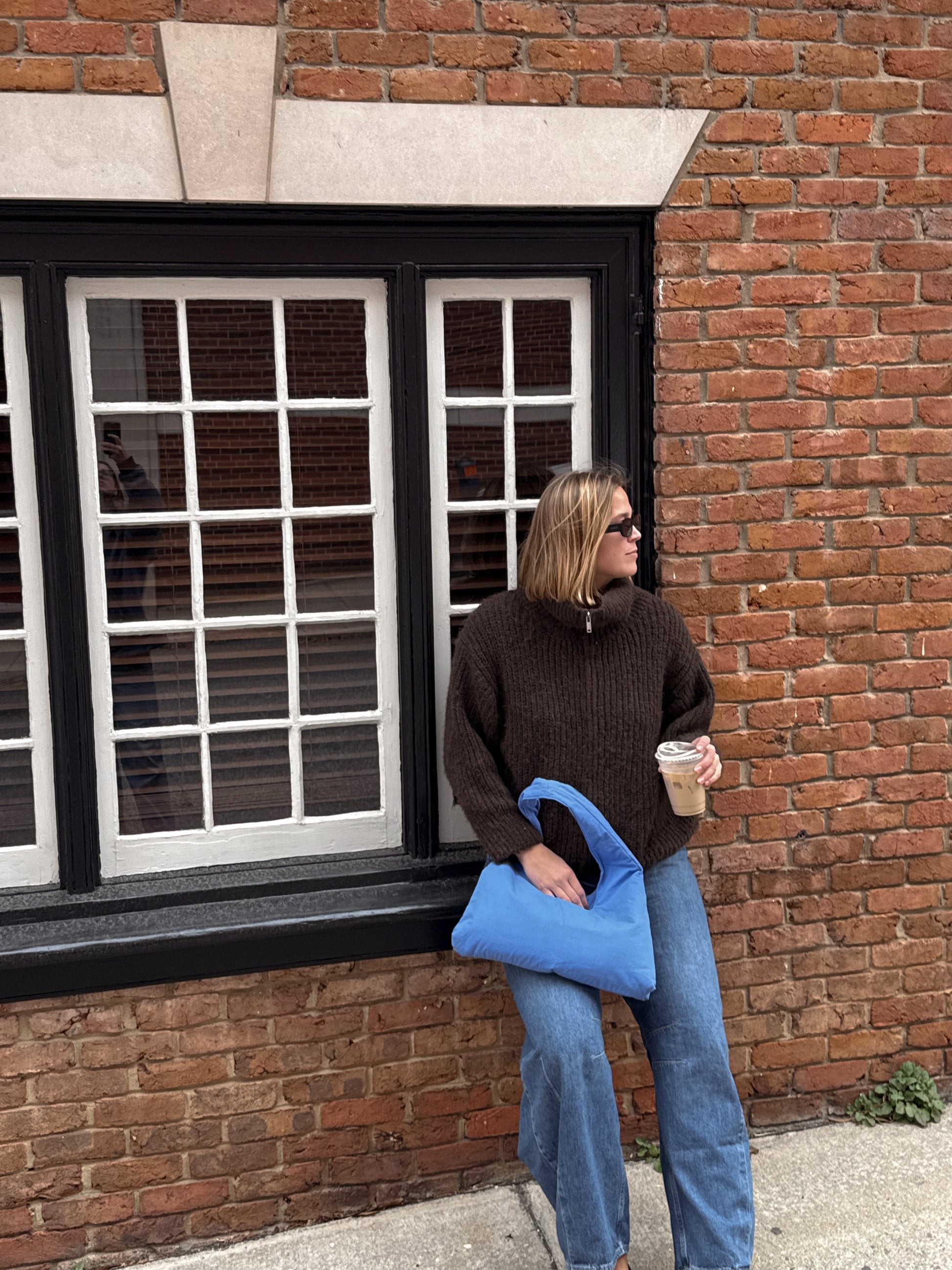 A classic, elevated tote, featuring an interior pocket. Made from blue repurposed cotton with batting for added stability and squishiness.