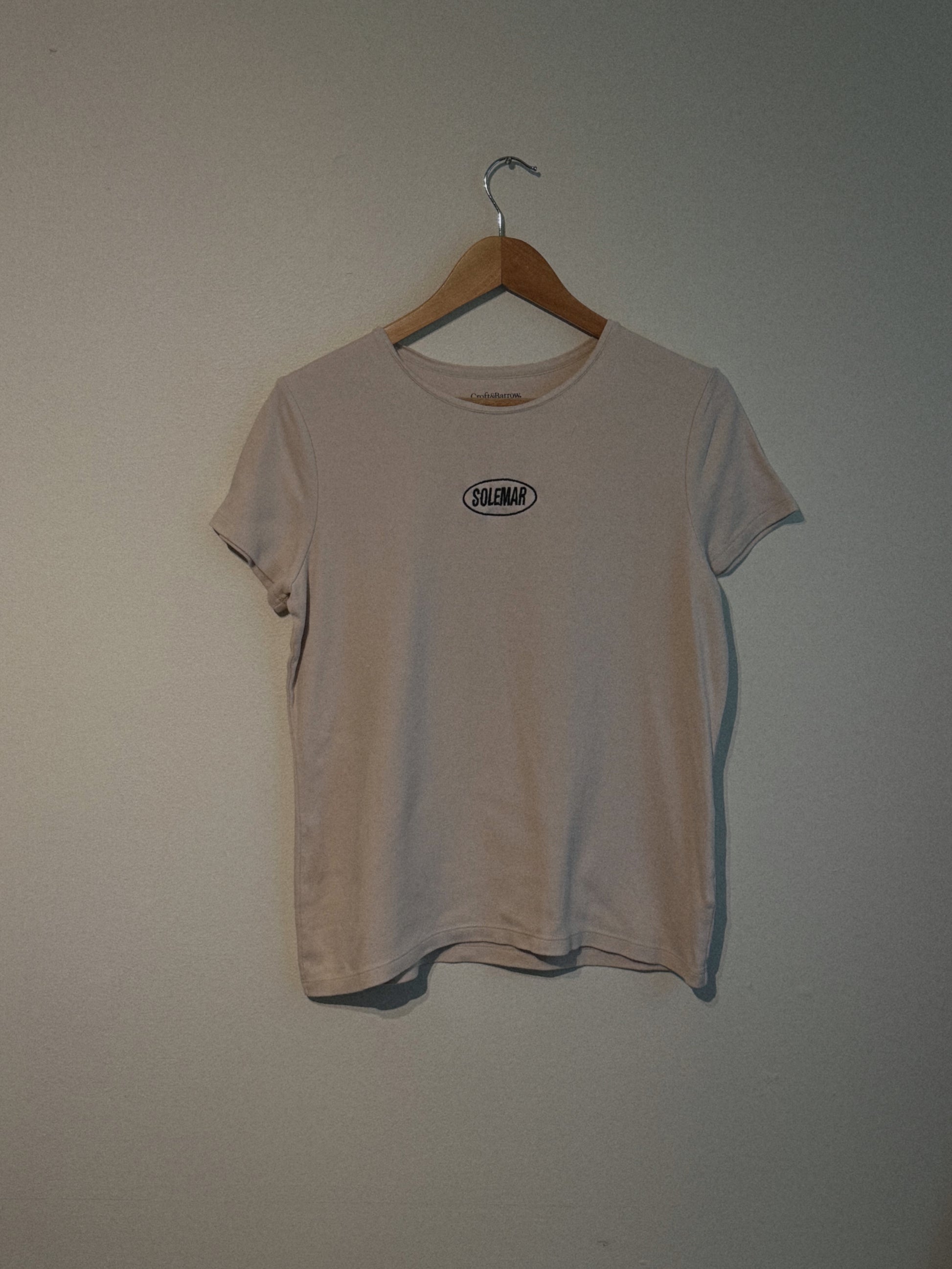 This tan tee features the SOLEMAR embroidered in black, and is a 1 of 1 made from an upcycled T-shirt.