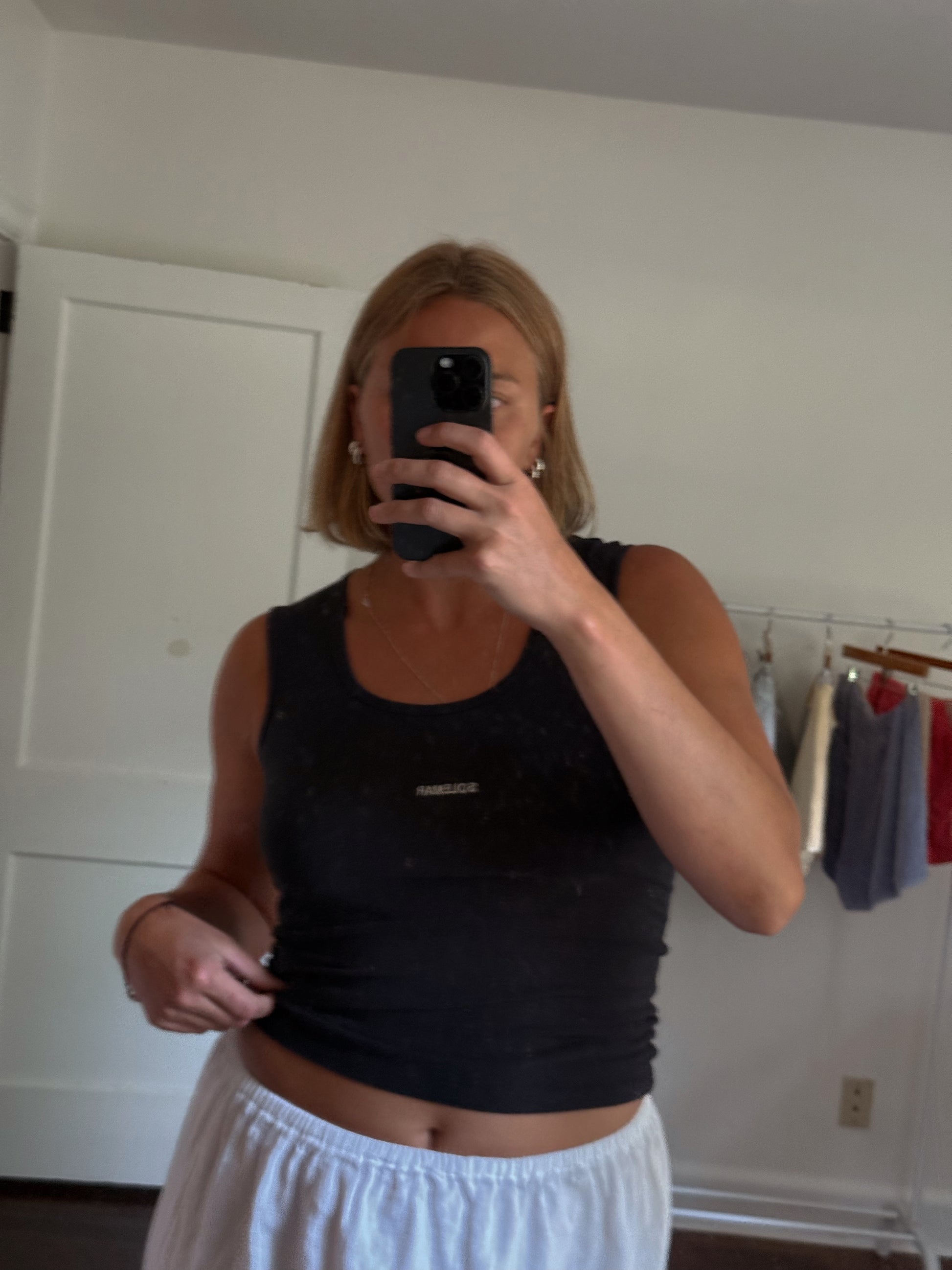 This black tank features SOLEMAR in white embroidery, and is a 1 of 1 made from upcycled materials.