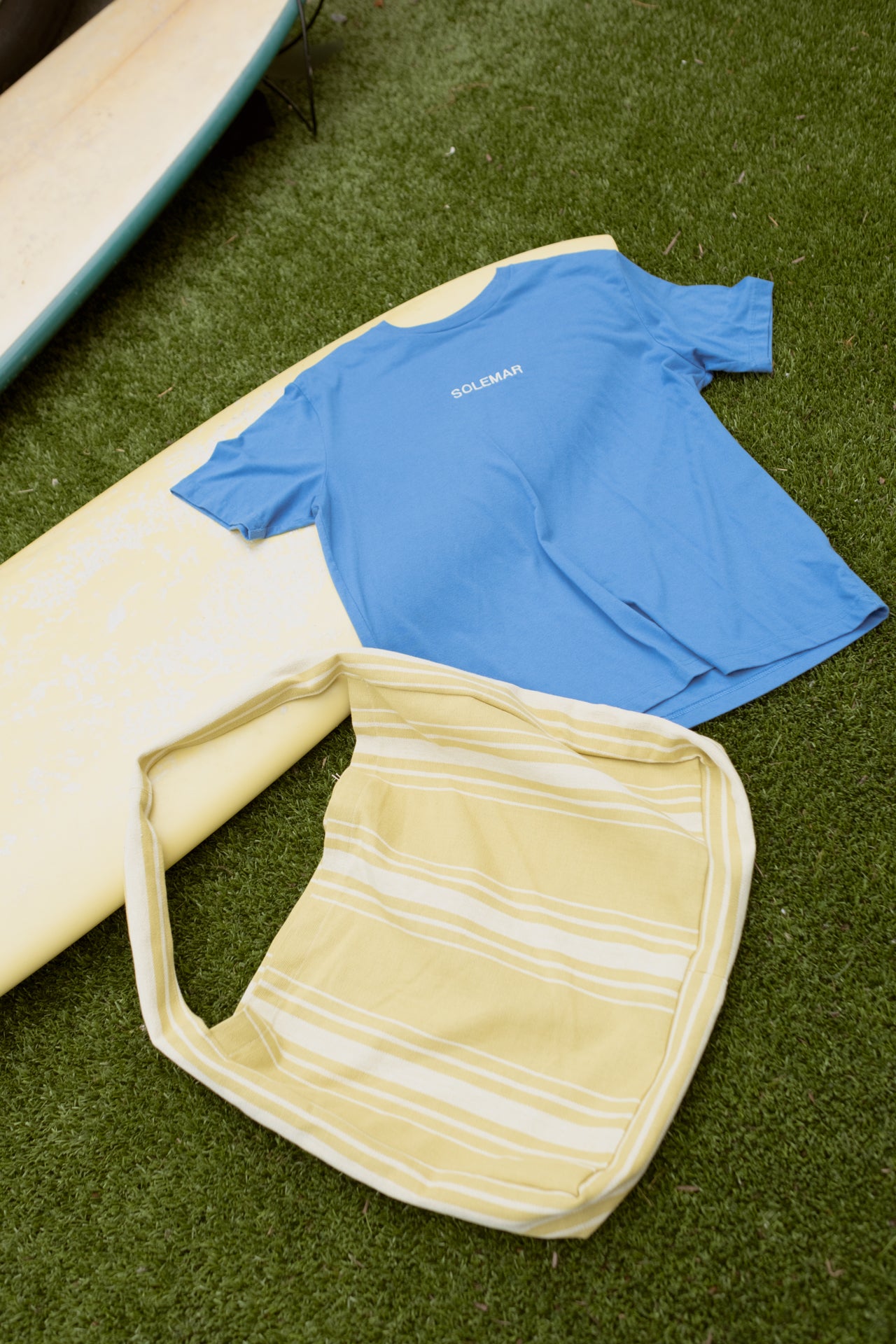 This blue tee features SOLEMAR in white embroidery, and is a 1 of 1 made from upcycled materials.