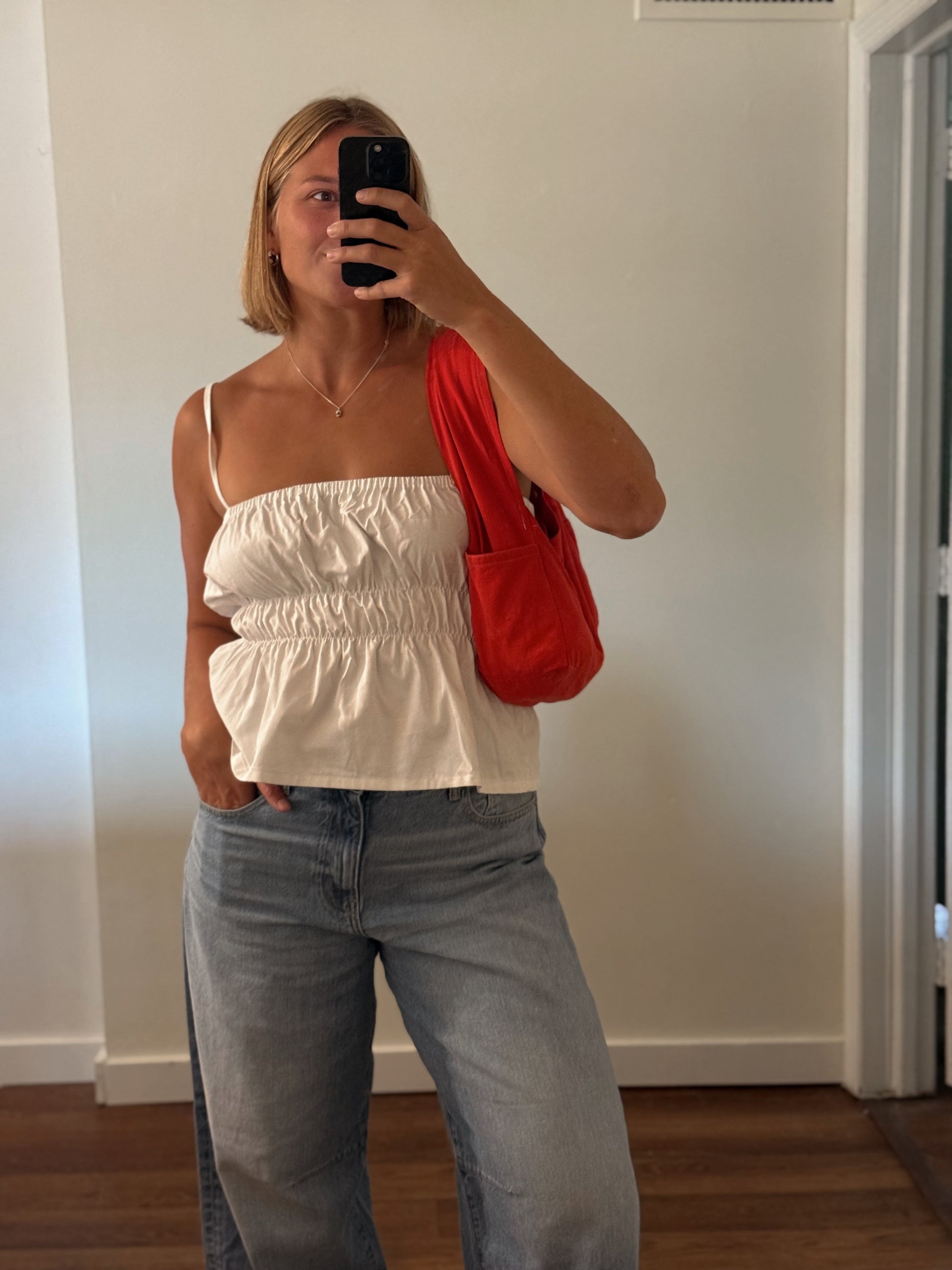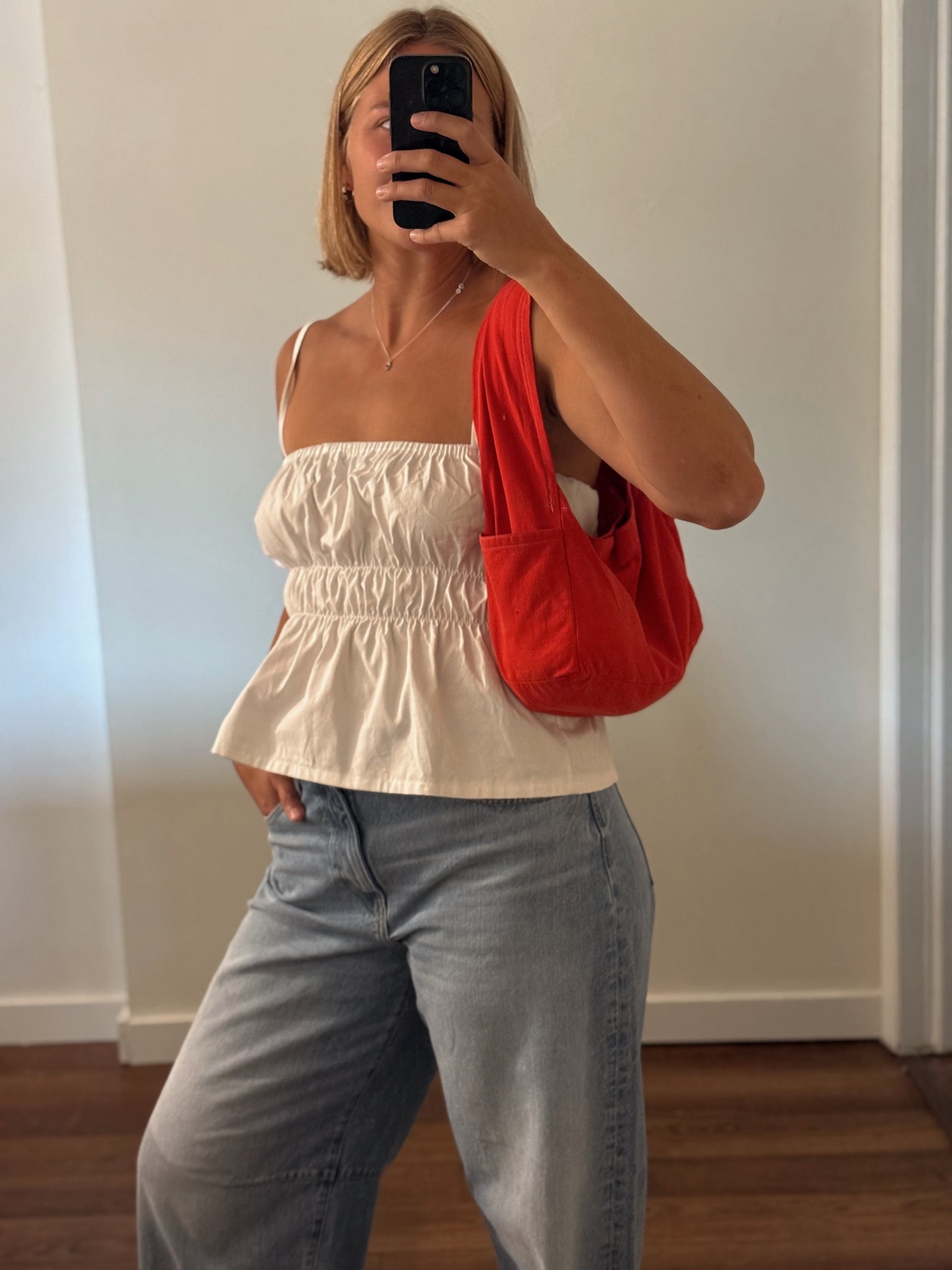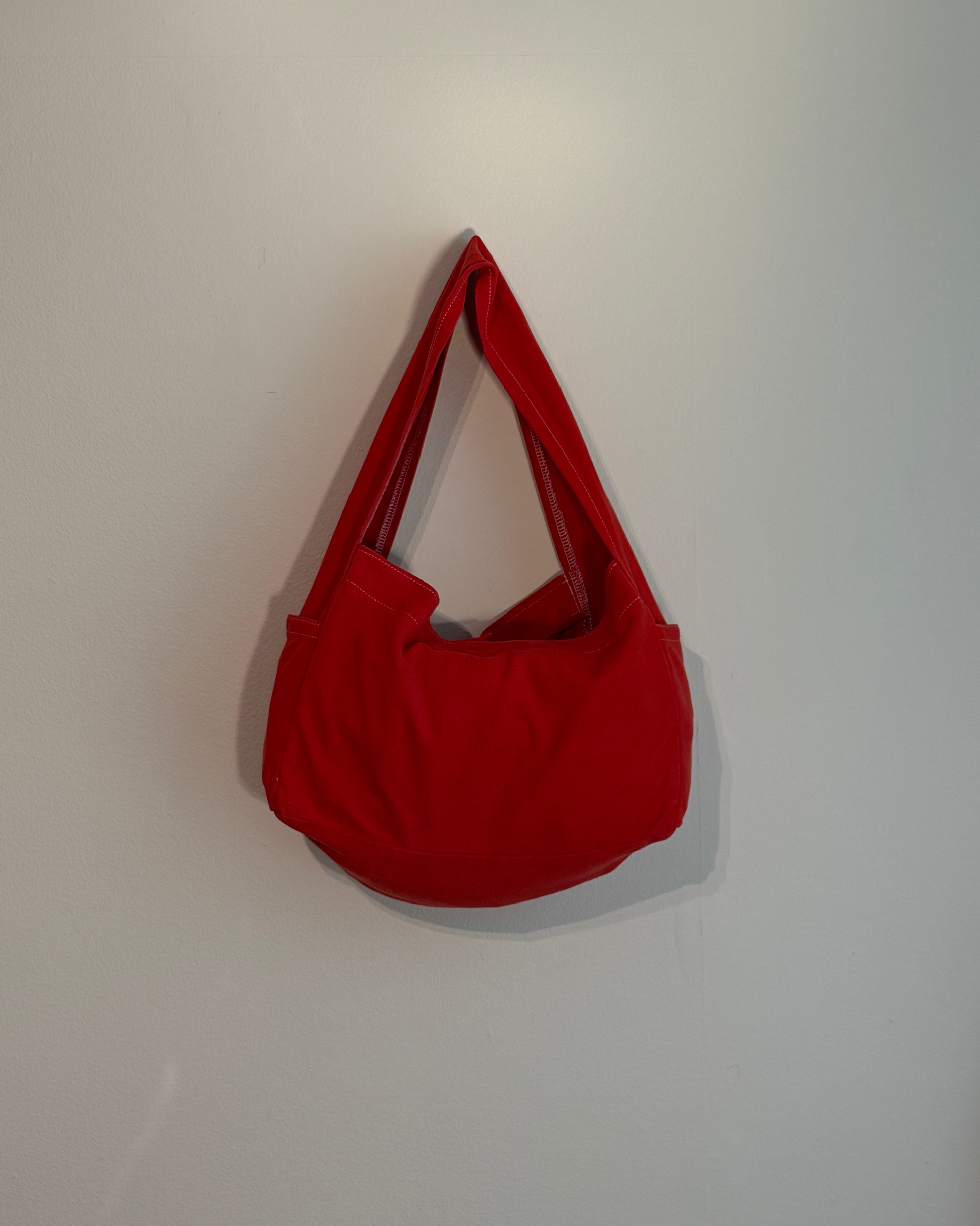 Introducing our upgraded boxy sling bag, enhanced with two exterior pockets and a magnetic snap closure to provide added security for your belongings.