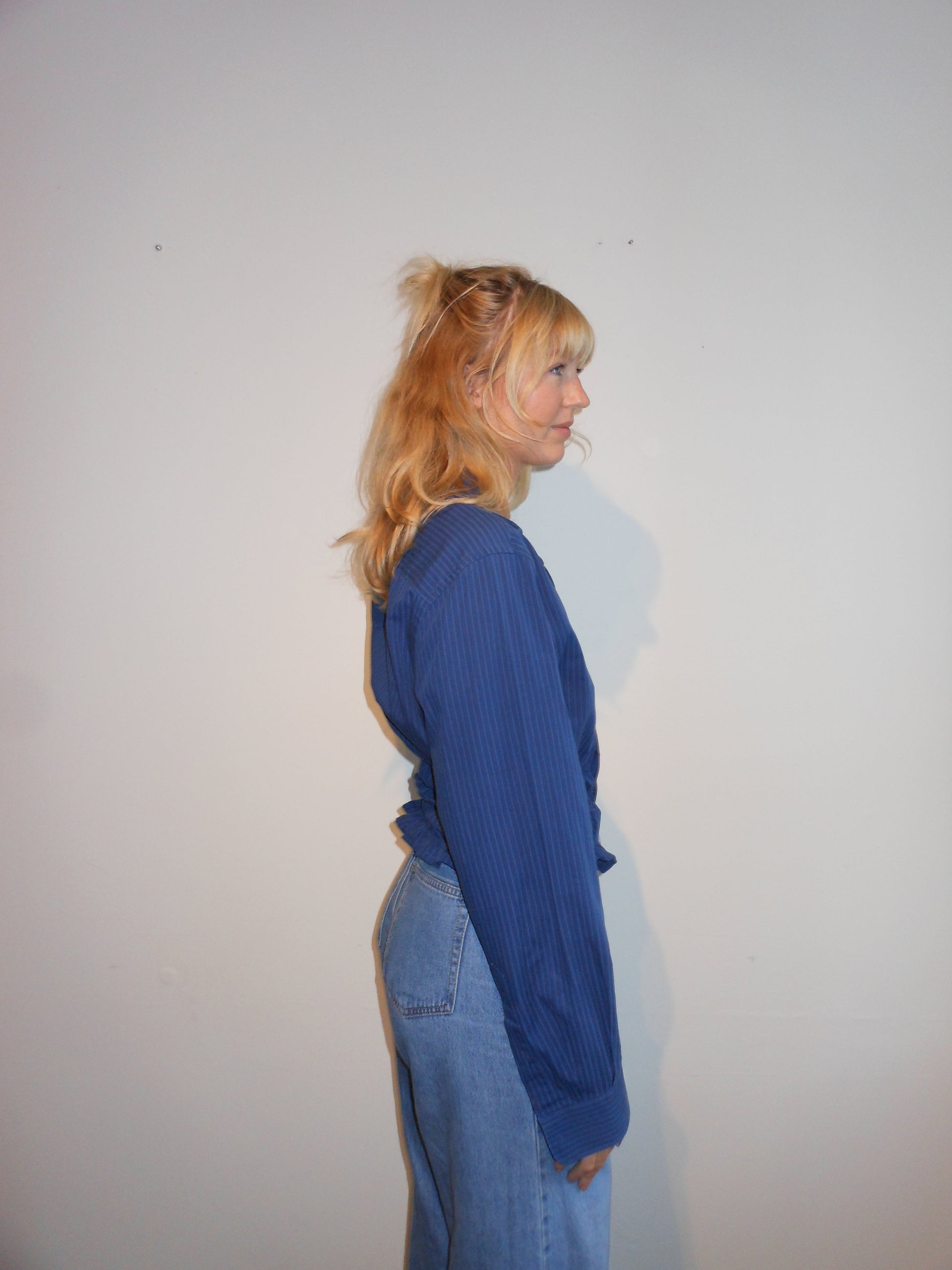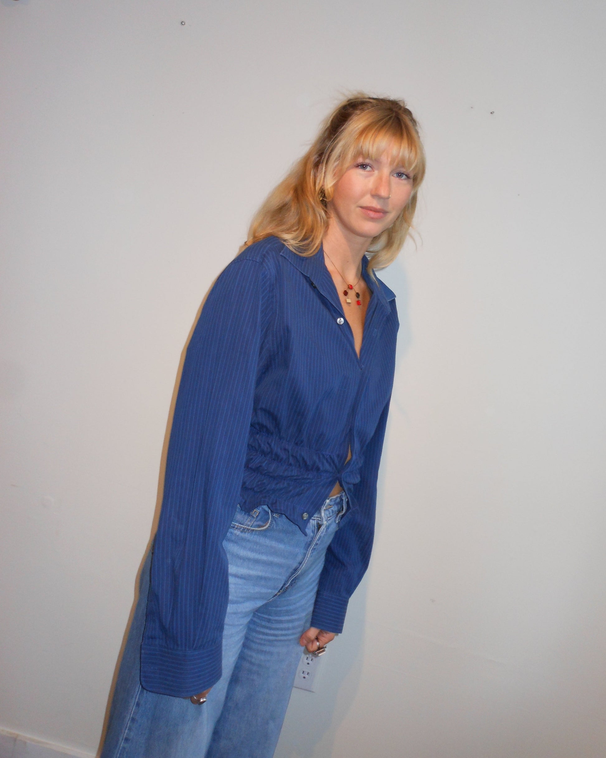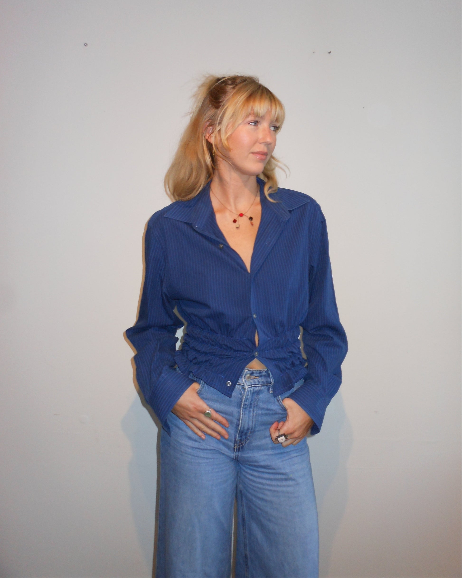 Cropped, Reworked Button Down in Blue and Light Blue Stripes with Cinched Waist.