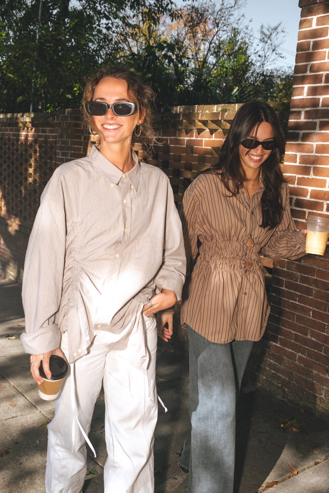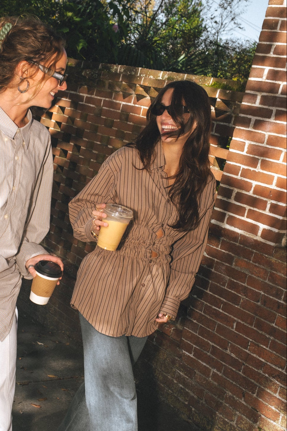 Reworked Button Down in Tan and black/brown stripes with cinched waist.