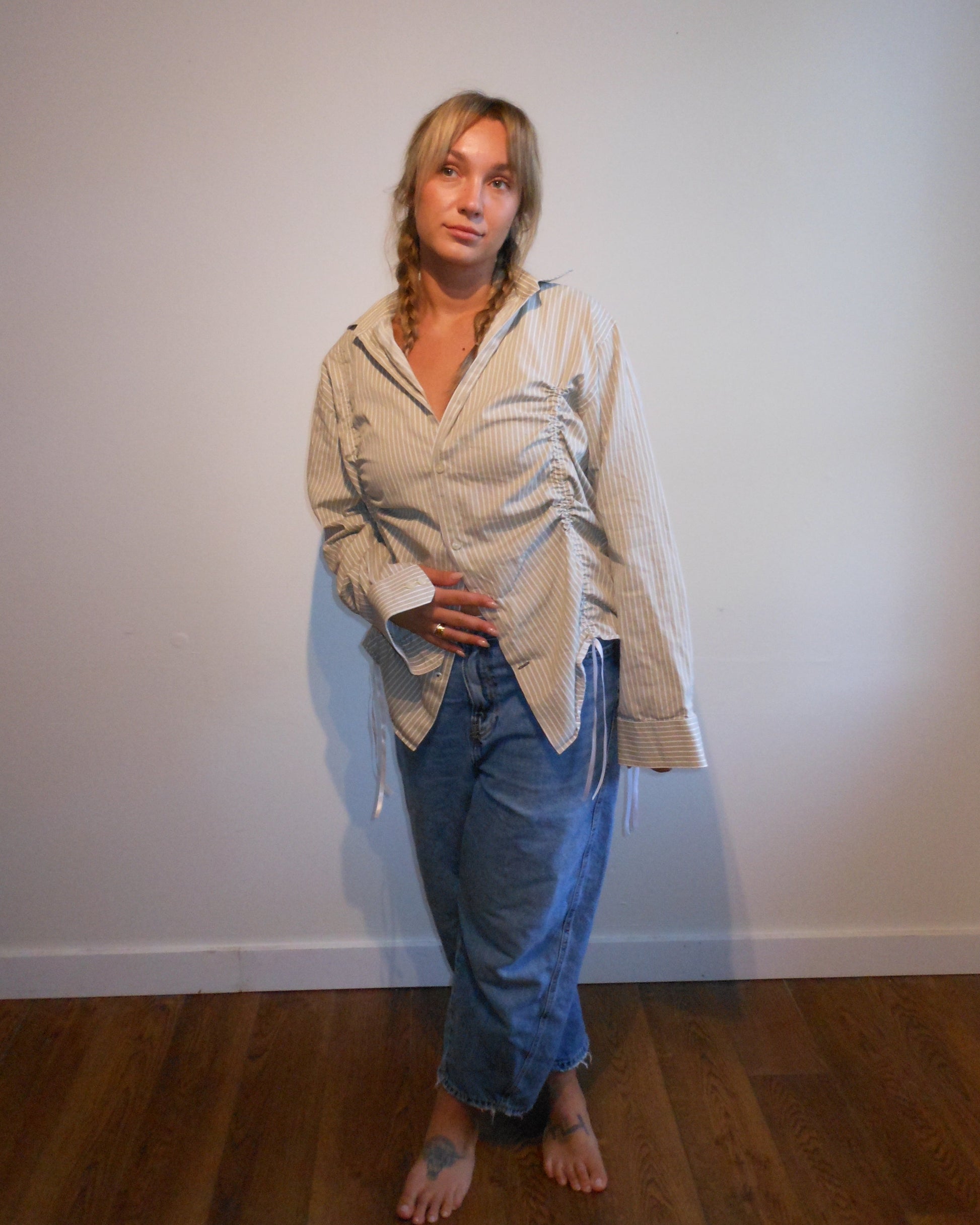 Reworked Button Down in Tan and White Stripes with Adjustable Ribbons.