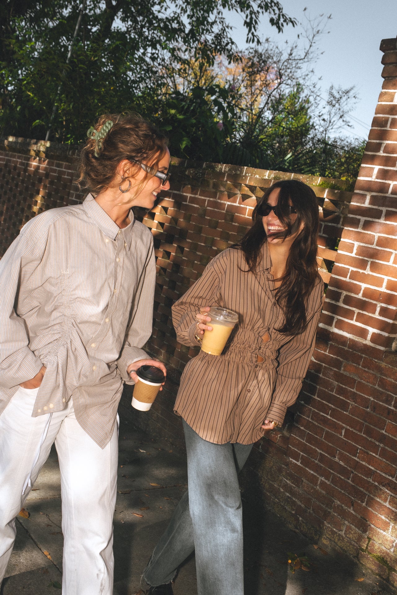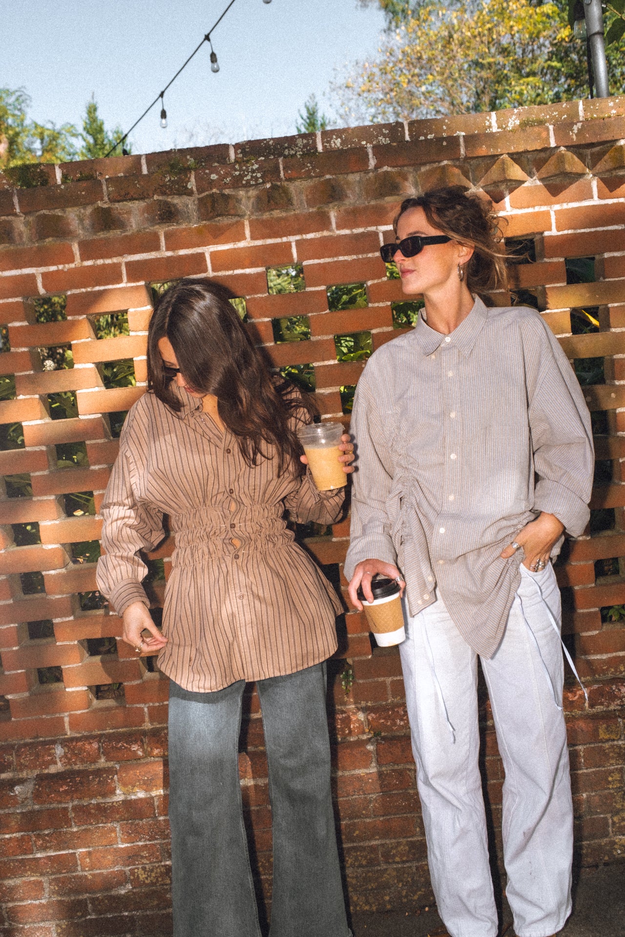 Reworked Button Down in Light Tan and white stripes with Adjustable Ribbons.