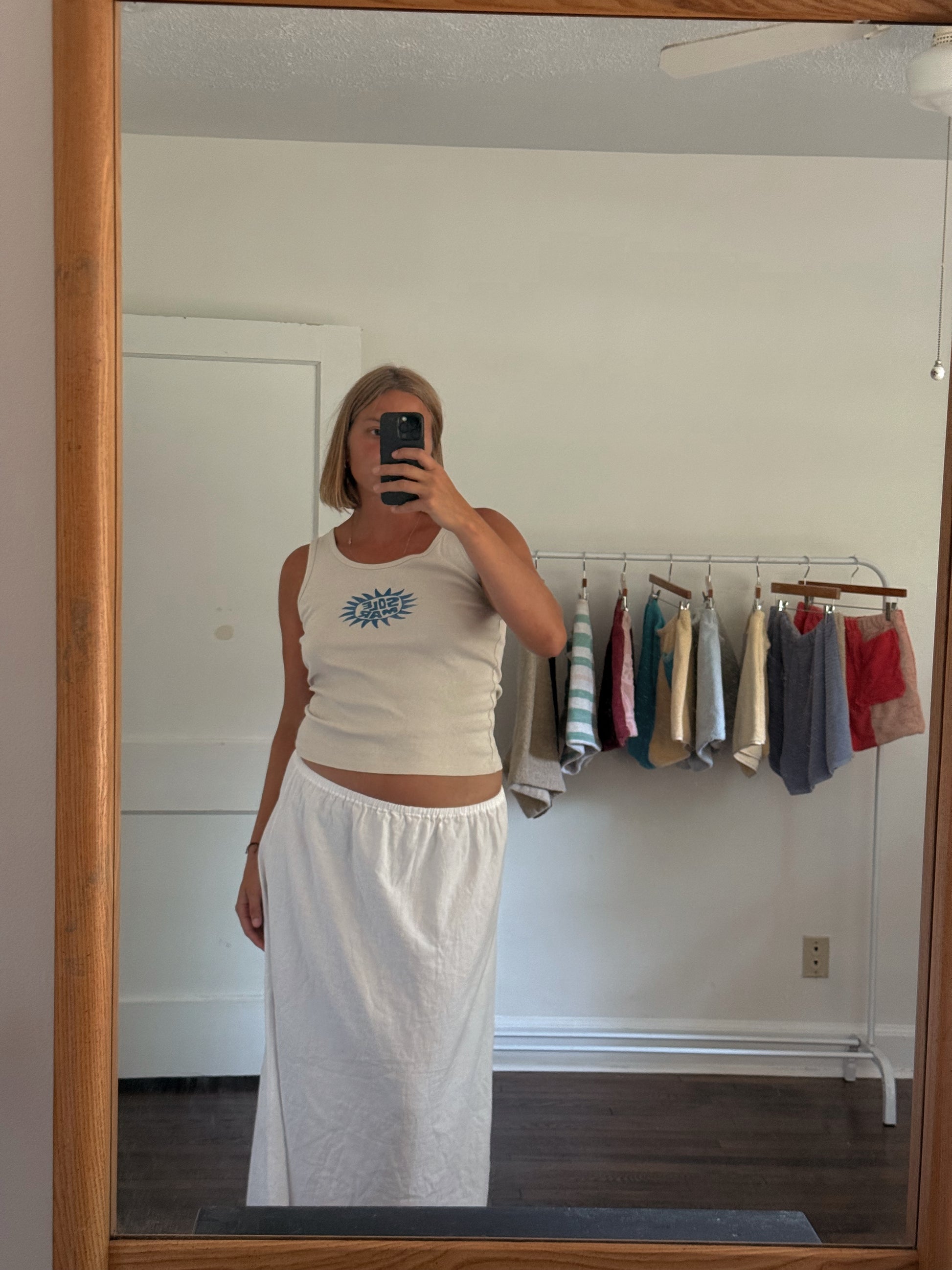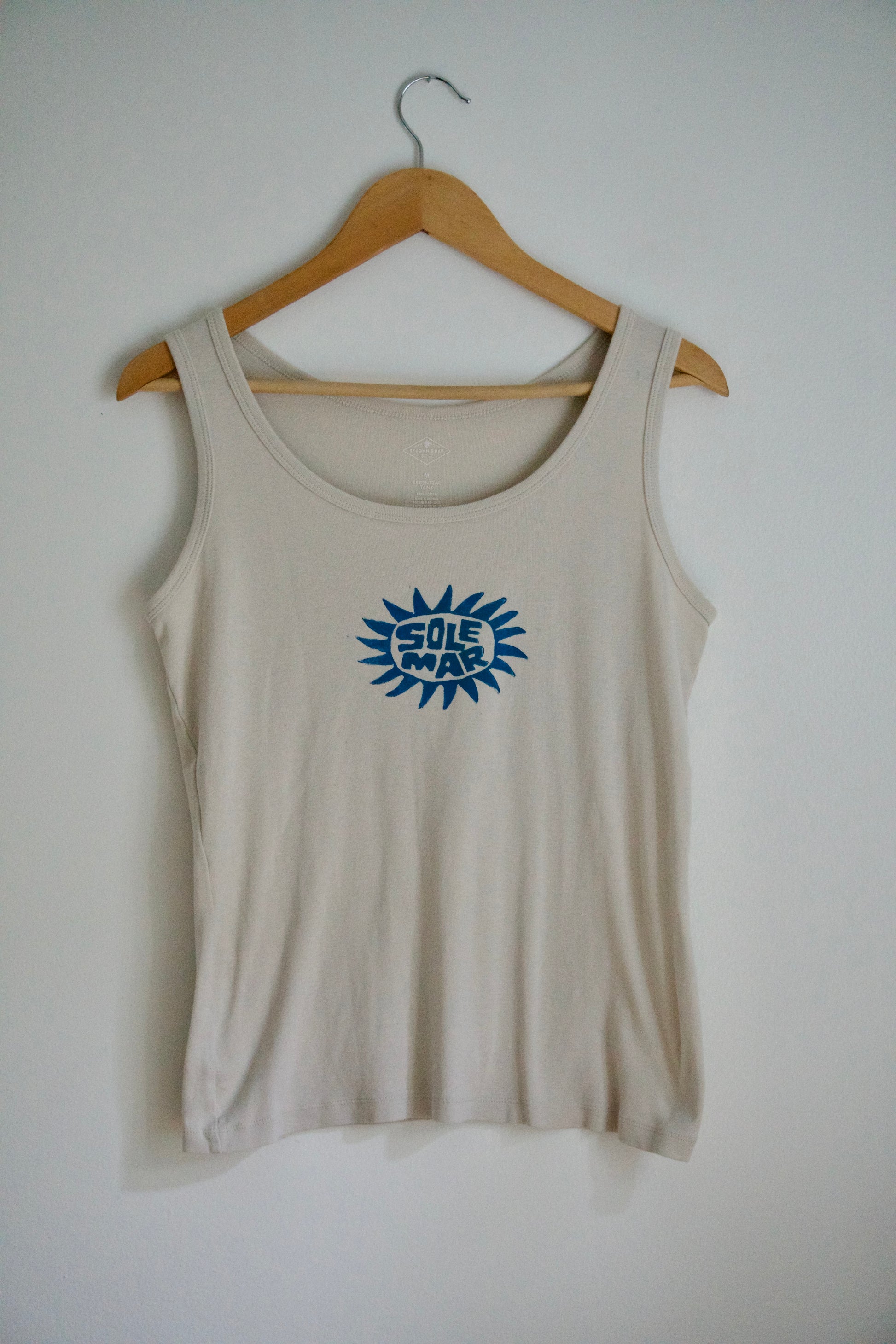 This 1 of 1 light cream tank is hand-block printed with our Solemar sun logo in blue and made from an upcycled tank.