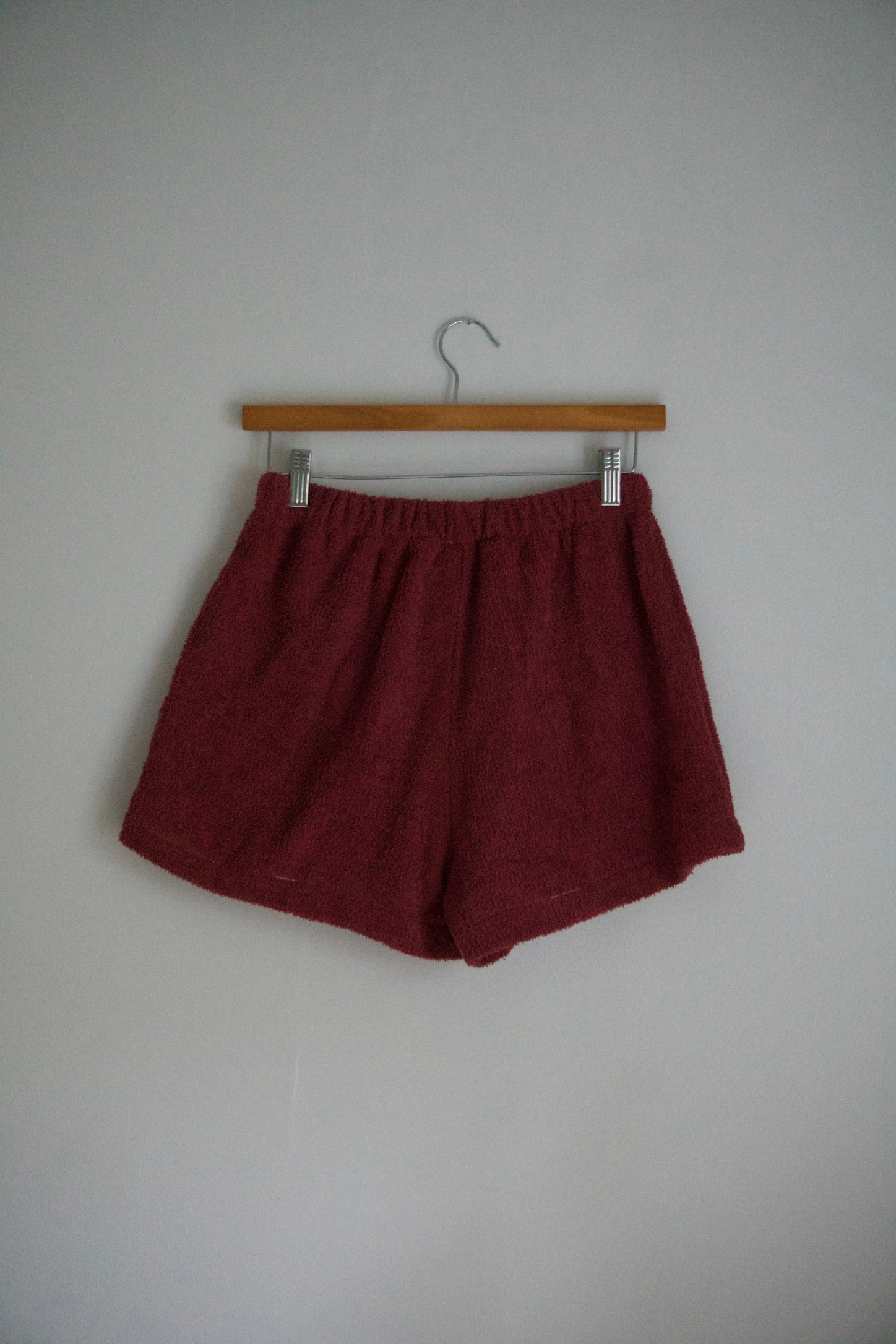 These size SMALL Towel Shorts are made with an elastic waistband, and out of one red/burgundy towel, and a light pink seashell hand towel.